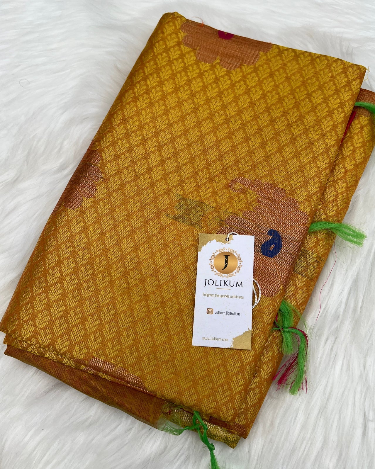 This elegant mustard-colored saree exudes warmth and traditional charm, making it a timeless choice for festive occasions and cultural celebrations. Crafted with a smooth, graceful drape, the saree is beautifully contrasted by a rich red border, adorned with intricate patterns or zari work that adds depth and a regal touch. The bold red frames the mustard body perfectly, creating a vibrant and harmonious color combination that stands out while remaining rooted in classic Indian aesthetics. Ideal for weddings, pujas, or special gatherings, this saree blends subtle sophistication with striking detail.